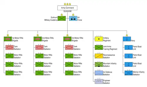 Abchazská armáda je dělená do tří okruhů: centrální (Suchumi), východní (Očamčyra) a západní (Picunda). V době míru disponuje silou 2100 - 2200[5] nebo 3000 - 5000[6] aktivních vojáků, ale v případě ohrožení by dokázala mobilizovat až 50 000 jednotek.