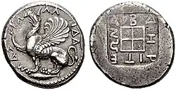 Abdérská stříbrná tetradrachma, platná v době kolem poloviny 5. století př. n. l.