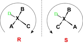 Jedním ze způsobů označování enantiomerů jsou značky R/S. V tomto postupu se chirální centra označují R nebo S podle systému, kde má každý substituent přiřazenu prioritu podle Cahnových–Ingoldových–Prelogových pravidel, s přihlédnutím k atomovým číslům. Když se substituent s nejnižší prioritou umístí směrem od pozorovatele, nastávají dvě možnosti: pokud priority zbývajících tří substituentů klesají ve směru hodinových ručiček, označí se izomer jako R, v opačném případě jako S.[10]