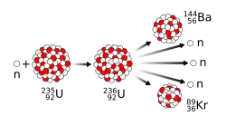 V jaderném reaktoru se získává energie štěpením jader vhodných izotopů. Jako příklad lze uvést běžné palivo uran a jeho jednu z mnoha štěpných reakcí[3]: