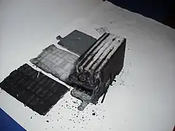 Rozdělaný akumulátor. Vlevo kladná elektroda, uprostřed separátor ze skelné vaty, nejvýš záporná elektroda. Vpravo celý článek