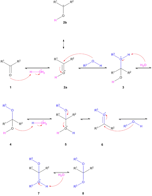 Karbonylová skupina sloučeniny 1 přijme proton z hydroniového kationtu, protonovaný karbonyl 2 je aktivován pro nukleofilní adici alkoholu. Struktury 2a a 2b jsou mezomery. Po deprotonaci molekuly 3 vodou vzniká poloacetal nebo poloketal 4; jeho hydroxylová skupina je protonována za tvorby oxoniového kationtu 6, jenž přijme druhou alkoholovou skupinu, čímž se vytvoří molekula 7, z níž se nakonec deprotonací vytvoří acetal 8. Zpětná reakce probíhá při přidání vody do reakční směsi. V zásaditém prostředí jsou acetaly stabilní. Při transacetalizaci diol reaguje s acetalem nebo dvěma různými acetaly a to s každým zvlášť.