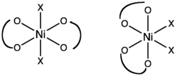 U trans-izomeru je skupina X axiální, v ethanolu tvoří vazby Ni-O. Tyto axiální vazby jsou delší (210,00 pm) delší než ekvatoriální (200,85 a 199,61 pm).[9]