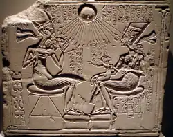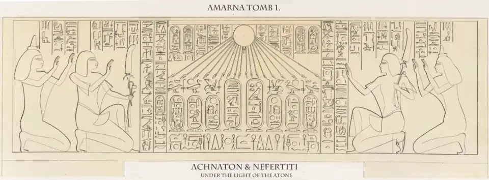 Kartuše Achnatona a Nefertit s bohyněmi Neit a Maat v paprscích Atona[24]