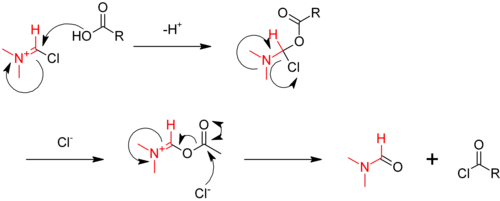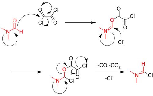 Katalyzátorem je zde dimethylformamid, který na začátku reaguje s oxalylchloridem za vzniku iminiového meziproduktu,