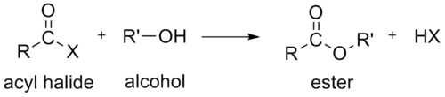 Reakce s alkoholy za vzniku esteru a halogenovodíku: