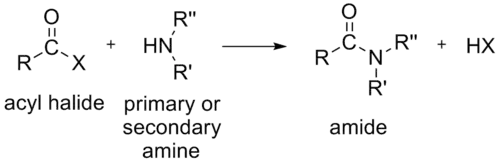 Reakce s amoniakem nebo primárním či sekundárním aminem za vzniku amidu karboxylové kyseliny a halogenovodíku: