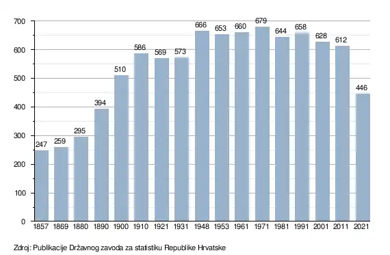 - ↑ Popis stanovništva, kućanstava i stanova 2021. – stanovništvo prema starosti i spolu po naseljima. Croatian Bureau of Statistics. 22. září 2022. Dostupné online.