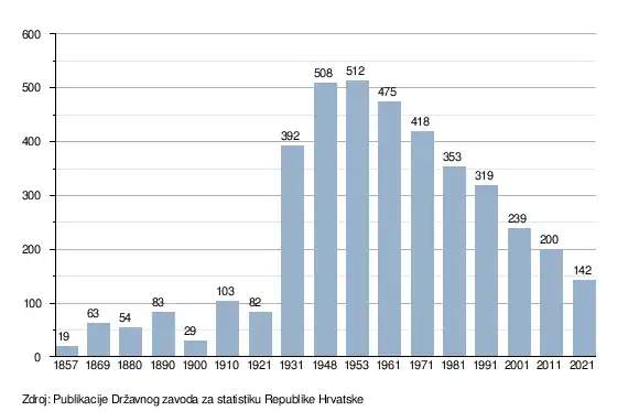 - ↑ Popis stanovništva, kućanstava i stanova 2021. – stanovništvo prema starosti i spolu po naseljima. Croatian Bureau of Statistics. 22. září 2022. Dostupné online.