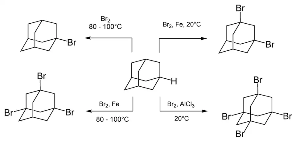 Zahříváním směsi adamantanu a bromu se vytváří monosubstituovaná sloučenina adamantanu, 1-bromadamantan. Za přítomnosti Lewisovy kyseliny lze dosáhnout vícenásobné bromace.[35]