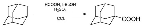 Karboxylací adamantanu kyselinou mravenčí vzniká kyselina 1-adamantankarboxylová.[39]