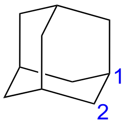 Systematický název adamantanu je tricyklo[3.3.1.13,7]dekan; IUPAC ale doporučuje používání názvu "adamantan".[26]