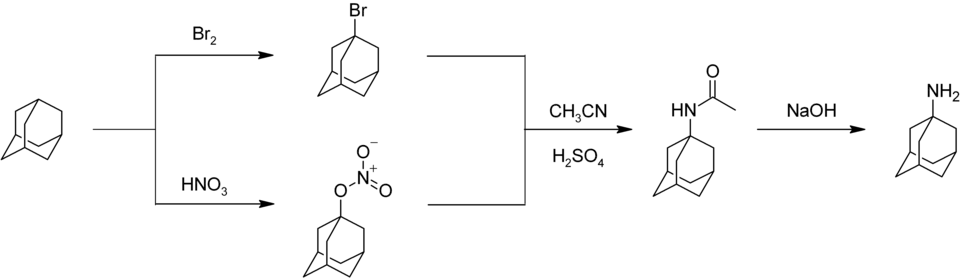 Nitrace adamantanu je obtížná.[41] Dusíkaté léčivo amantadin vzniká reakcí adamantanu s bromem nebo kyselinou dusičnou za vzniku sloučeniny s bromem nebo nitroesteovou skupinou v poloze 1. Reakcemi kterékoliv z těchto sloučenin s acetonitrilem se tvoří acetamid,který lze hydrolyzovat na 1-adamantylamin:[42]