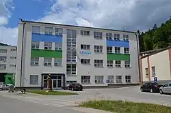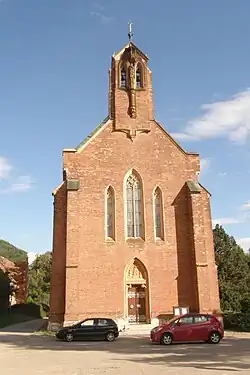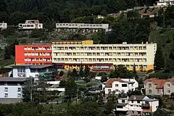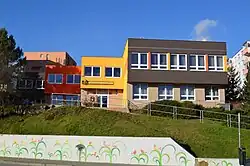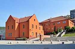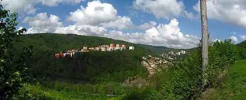 ![]() Kostel sv. Barbory a zděný bytový blok (tzv. „Hradčany“) | |