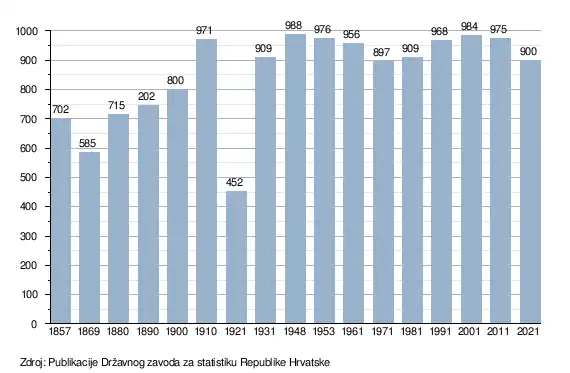 - ↑ Popis stanovništva, kućanstava i stanova 2021. – stanovništvo prema starosti i spolu po naseljima. Croatian Bureau of Statistics. 22. září 2022. Dostupné online.