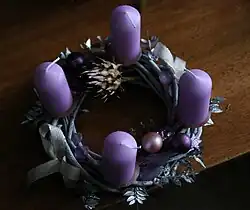 Většina protestantských církví nyní používá modrou barvu k rozlišení období adventu od postní doby a tedy na adventním věnci je fialová barva nahrazena modrou. Modrá je někdy používána jako symbol královské hodnosti. Některé kostely používají modrou jako symbol noční oblohu, očekávání blížícího příchodu krále, Ježíše Krista na svět, nebo jako symbol vody Genesis, počátek nového stvoření. Některé kostely, včetně některých katolických kostelů, zachovávají tradiční použití fialové. Takové současné použití dvou barev poskytuje dojem harmonického souladu mezi fialovou a modrou.[8]