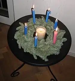 Modrá barva je v některých zemích (USA, Velká Británie) populární alternativou fialových a červených adventních svíček a ozdob. Její častější používání v období adventu a u adventních svíček je přisuzováno protestantským církvím, zejména luterským církvím a anglikánským církvím. V tomto liturgickém období je fialové (modré) barvě připisována symbolika pokání, ztišení a čekání (na příchod Krista).[5]