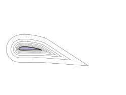 Příklad výpočetní mřížky pro aerodynamický profil. Hustota byla zvolena nižší dál od profilu. Výpočetní body jsou tam, kde se protínají zhruba kolmé čáry (nakreslené nejsou všechny). Pro názornost byla hustota zvolena nižší, v simulacích bývá mřížka mnohem hustší.