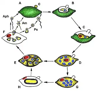 Schéma životního cyklu tří druhů afelidií: Aphelidium (Aph), Amoeboaphelidium (Am) a Pseudaphelidium (Ps). A – kontakt zoospory s povrchem buňky hostitele, B – vniknutí do hostitelovy buňky, C – améboidní parazit s jedním jádrem (modře) se živí obsahem hostitelovy buňky, D – mnohojaderné plazmodium se zbytkovým tělískem (červeně) vyplní celý prostor hostitelovy buňky, E – dělení pazmodia na jednojaderné buňky, F – zralé zoospory opouštějí hostitelovu buňku, G – tvorba klidové spory, H – klidová spora.