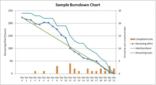 Harmonogram projektu používaný obvykle ve formě Gantova grafu pro klasické řízení projektu bývá nahrazen, nebo doplněn tak zvaným Burndown grafem. Burndown chart (graf) ukazuje množství práce a splněných úkolů v rámci jedné iterace. Používá se forma, kdy původní pro iteraci plánovaný objem práce a úkolů ubývá. Projektový tým jakoby „spaluje“ práci, která je před ním.