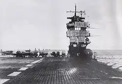 Pohled od přídě na můstek a letovou palubu Akagi během nájezdu do Indického oceánu. Můstek je obložen matracemi jako ochranou proti střepinám.