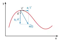 Pokud těleso mění směr i velikost rychlosti zároveň, jedná se o nerovnoměrný křivočarý pohyb. V tomto případě se zrychlení podílí na změně směru pohybu i velikosti rychlosti pohybu a je výhodné rozložit zrychlení do dvou směrů. Do směru pohybu, tzn. do směru tečny k trajektorii, a do směru kolmého k pohybu, tzn. do směru normály k trajektorii. Hovoříme pak o tečném zrychlení ovlivňující velikost rychlosti a normálovém (též dostředivém) zrychlení uvolňující směr pohybu.