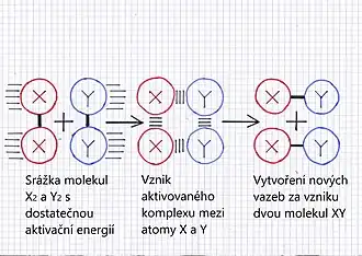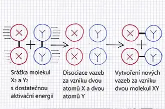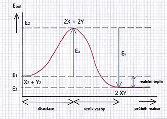 Na počátku mají molekuly X2 a Y2 celkovou potenciální energii E1. K rozštěpení (disociaci) molekul může dojít, jestliže dojde ke srážce a energie molekul překročí potenciální barieru E2. Nejmenší možné množství energie, které je třeba k rozštěpení molekul je aktivační energie Ea. Disociované atomy 2X a 2Y se pak sloučí na dvě molekuly XY za uvolnění vazebné energie Ev. Rozdíl mezi spotřebovanou akční energií a vazebnou energií je reakční teplo ∆H:
