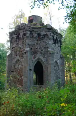 Stavba byla původně rozdělena na dvě části, na první patro ve výšce 5,6 metrů, které bylo tvořeno dřevěnou podlahou podepřenou trámy, a na nástavbu o výšce 2,03 metru. V prvním patře se nacházelo osm otvorů ve tvaru lomeného oblouku, vždy jedno na každé straně osmiúhelníku. Tyto otvory mohly sloužit jako střílny či pro pozorování lesní zvěře. Nástavba měla – stejně jako věž – půdorys osmiúhelníku, jen v menším měřítku, a byla využívána hlavně při špatném počasí, kdy nebylo možné využít ochoz. Do prvního patra věže se dalo vystoupat po levotočivém schodišti o 35 stupních, které vedlo středem stavby. Dále následoval dřevěný desetistupňový žebřík do prostoru nástavby, odkud bylo možné vyjít východem ve tvaru lomeného oblouku na ochoz věže. Ochoz byl obestavěn zábradlím, které bylo stejně jako celá věž postaveno z přírodního neomítnutého kamene. Vstup do přízemí věže byl zajištěn ze dvou světových stran – severní a jižní – a to dřevěnými dveřmi se skleněnou výplní ve tvaru gotického lomeného oblouku. Východní a západní strana byla osazena vysokými okny ve stejném tvaru jako vstupní otvory, taktéž se skleněnou vitráží. Ve čtyřech zbylých částech osmistěnu byly tvary oken pouze imitovány pomocí nik. Na všech osmi nárožích byly opěrné pilíře (polosloupy) čtvercového půdorysu se zešikmenou vrchní hranou.