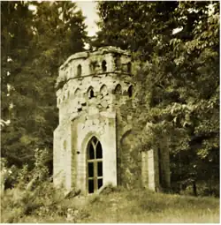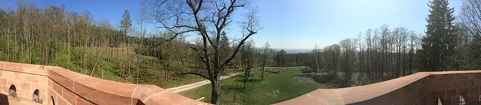 ![]() Celkový pohled na Alainovu věž s památným dubem a jezírkem pod místním pramenem | |