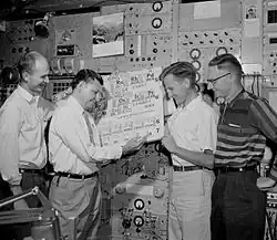 Albert Ghiorso drží periodickou tabulku s nově objeveným prvkem lawrenciem v roce 1961 (spoluobjevitelé Robert Latimer, Torbjorn Sikkeland a Almon Larsh)