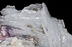 - Fyzikální vlastnosti: Tvrdost 6–6,5, křehký, hustota 2,62 g/cm³, štěpnost velmi dobrá podle {001} a {010}, lom nerovný.