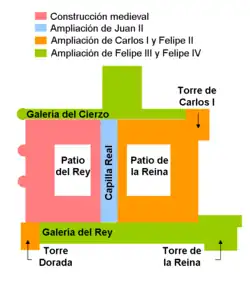 První rozšíření stavby provedl v roce 1537 španělský král Karel I., ( který vládl jako císař Svaté říše římské , Karel V. Habsburský). V roce 1636 španělský král Filip IV. pověřil architekta Juana Gómeze de Moru pracemi na exteriérech budovy. Palác se stal rezidencí španělské královské rodiny. Byl proslulý svými slavnými uměleckými poklady. V roce 1734, za vlády Filipa V. vypukl v paláci požár, který budovu téměř zničil. Bylo ztraceno mnoho uměleckých pokladů včetně více než 500 obrazů. Některá díla se podařilo zachránit, například Las Meninas od Diega Velázqueze.