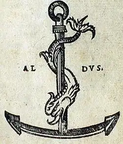 Aldovým tiskařským znakem byla kotva s obtočeným delfínem, se jménem ALDUS a s heslem Festina lente („Pospíchej pomalu“). Tento způsob trvalého a jednotného označování tisků se později obecně prosadil a je jedním z prvních příkladů firemního loga a ochranné známky.