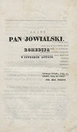- Pan Jowialski (1832), komedie líčící šlechtickou rodinu, jejíž každý člen vyniká jinou variantou okouzlující připitomělosti, do které přijdou dva mladí romantičtí umělci.
