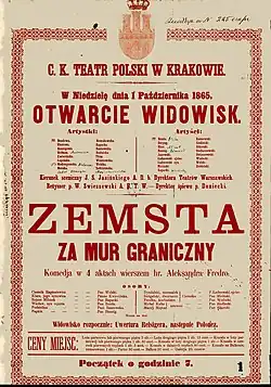 - Zemsta (1834, Pomsta), vrcholné autorovo dílo,[3] líčící dva venkovské šlechtice, tvrdohlavé furianty, kteří se soudí o zeď, která rozděluje zámek, o jehož vlastnictví se dělí, na dvě části. Na tomto pozadí se odehrává milostný vztah dvou mladých lidí, které toto nepřátelství rozděluje. Navzdory hádajícím se rodičům uzavřou sňatek, který přispěje i k usmíření sousedského sporu.