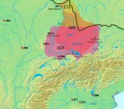 Horní Germánie (Germania Superior) zasahovala i do oblasti mezi horním Rýnem a horním Dunajem (přibližně oblast Černého lesa). Římané tuto oblast nazývali Agri Decumates („desátková pole“), původ tohoto názvu je neznámý. Kolem ní byla vybudována opevněná hranice zvaná Limes Germanicus. Alamanské ozbrojené skupiny pravidelně hranice překračovaly, útočily na provincii Germania Superior a stěhovaly se do oblasti Agri Decumates. V 5. století vytvořili konfederaci, která se usídlila v Alsasku, odkud dále expandovala do oblasti švýcarské náhorní plošiny a dnešního Bavorska a Rakouska. Počátkem 8. století dosáhli alpských údolí.
