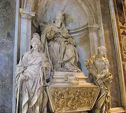 - Náhrobek papeže Lva XI. s trůnící postavou papeže mezi alegorickými figurami Obrany a Hojnosti (1644), Bazilika svatého Petra