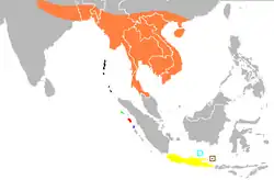 jižní Myanmar, jižní Thajsko, Malajsie, Singapur, Borneo, Sumatra, Mentawajské ostrovy |