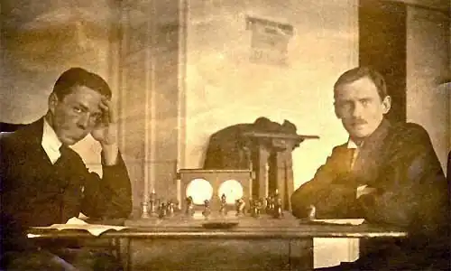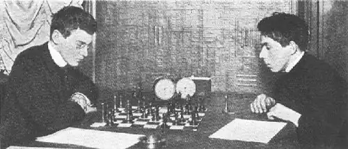 Mladý Aljechin (vlevo) při partii proti Romanovskému