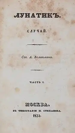 - Lunatik: Případ (1834, Лунатик: Случай). Hlavním hrdinou románu, jehož děj osciluje mezi snem a realitou, je mladý náměsíčný matematik, který v hořící Moskvě roku 1812 prožívá fantastická dobrodružství.