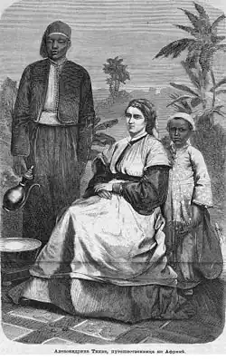 Ačkoli měla Alexine potřebné služebníky a o domorodých obyvatelích Afriky hovořila jako o „divoších“, byla otevřeně proti obchodu s otroky a systematickým zvěrstvům, s nimiž se setkala. Napsala: „Neboť pokud v této zemi existuje něco hříšnějšího než divoši, jsout to Evropané a obchodníci. Jakmile jsou na Nilu, považují sami sebe nad všechny božské a lidské zákony. Okrádají, zabíjejí a dělají, co jim přijde na mysl. “ Koupila několik otroků a pak byla pobouřena, že sama byla později obviněna z otrokářství.[3]