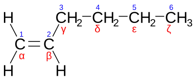 Modrá čísla označují číslování uhlíkových atomů. Červené symboly představují běžné označení těchto atomů. U alfa alkenů jsou dvojné vazby mezi uhlíky s čísly 1 a 2 či α a β.