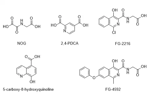 - ↑ T. L. Yeh, T. M. Leissing, M. I. Abboud, C. C. Thinnes, D. Atasoylu, J. P. Holt-Martyn, D. Zhang, A. Tumber, K. Lippl, C. T. Lohans, I. K. Leung, H. Morcrette, I. J. Clifton, T. D. Claridge, A. Kawamura, E. Flashman, X. Lu, P. J. Ratcliffe, R. Chowdhury, C. W. Pugh, C. J. Schofield. Molecular and cellular mechanisms of HIF prolyl hydroxylase inhibitors in clinical trials. Chemical Science. September 2017, s. 7651–7668. doi:10.1039/C7SC02103H. PMID 29435217.