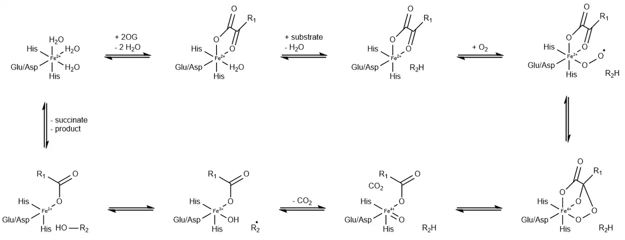 První krok spočívá v navázání αKG a substrátu na aktivní místo. αKG se na Fe2+ navazuje jako bidentátní ligand, substrát je udržován v těsné blízkosti nevazebnými interakcemi. Následně se molekulární kyslík napojí na Fe v poloze cis vůči donorovým skupinám αKG. Nekoordinovaný konec superoxidového ligandu reaguje s uhlíkem, což vede k uvolnění CO2 a zvorbě železičitého oxomeziproduktu. akto vzniklé Fe=O centrum následně oxygenuje substrát.[1][2]