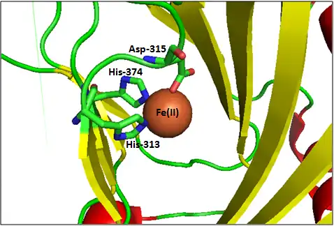 Aktivní místo zahrnuje 2-His-1-karboxylátový (HXD/E...H) zbytek, katalytický železnatý ion je navázán na dva histidinové zbytky a jeden zbytek kyseliny asparagové nebo glutamové. Na jednu stranu Fe centra se napojuje N2O triáda, zbylá tři místa na oktaedru jsou přístupná pro αKG a O2.[1][2] Podobné faciální navázání Fe se vyskytuje u cysteindeoxygenázy