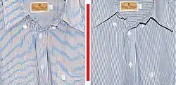 Na pravé části obrázku je tatáž košile vyfotografovaná tímtéž aparátem zblízka tak, aby hustota proužků promítnutých objektivem na CCD byla výrazně nižší než hustota jeho buněk. (Ve skutečnosti je i na pravé části obrázku ve výstřihu košile při pozorném pohledu patrné jemné moaré, které tentokrát vzniklo interferencí osnovy samotné tkaniny s buňkami CCD.)