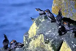 - ↑ a b c d e f g h i j k JONES, Ian L. Crested Auklet (Aethia cristatella), version 1.0. Birds of the World. 2020. Dostupné online [cit. 2025-04-20]. ISSN 2771-3105. doi:10.2173/bow.creauk.01. (anglicky)