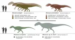 Průměrná délka druhu Allosaurus fragilis byla přibližně 7–9 m, ačkoli se zdá, že některé odrostlé kusy (jako třeba exemplář AMNH 5767, jež byl původně řazen k samostatnému rodu Epanterias) mohly měřit až 12 m.[19] Porovnatelné velikosti je pak také Allosaurus „jimmadseni“ (z Utahu a Wyomingu), jehož největší dochovaný dospělý exemplář, známý od roku 2003, mohl být dlouhý 8,8 m. Z tohoto druhu však také známe nedospělé jedince, jako např. DINO 11541, který mohl mít na délku zhruba 5,6 metru. Obří exempláře o délce přes 12 metrů, popsané jako Epanterias amplexus nebo Edmarka rex, mohou být ve skutečnosti rovněž jen odrostlí zástupci rodu Allosaurus.[20]
