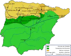 Ačkoli Almanzor bojoval hlavně proti království León a Kastilie, vydrancoval v roce 985 i Barcelonu. V roce 988 vyplenil Santiago de Compostela v Galicii a v roce 997 španělský León, přičemž katedrální zvony nechal roztavit pro lucerny pro velkou mešitu v Córdobě. Almanzor vedl několik tažení proti království Navarra, včetně jeho nejdelšího tažení, ve kterém porazil kastilskou armádu v bitvě u Cervera.