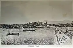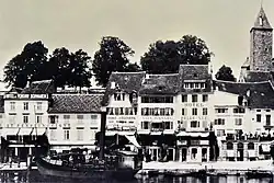 - ↑ Gossauer's claimed "1879" (in fact 1878) photography was supplemented with graphic elements: ships, waves and grass in the foreground, as wells as the causeway with steam railway, carriages and pedestrians added. First published in "Geschichte der Stadt Rapperswil", the photograph was predated because the railway causeway was still under construction in 1878.